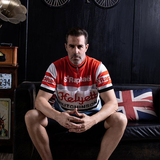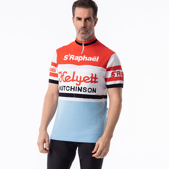 - Das Retro-Radtrikot von St. Raphael Helyett Hutchinson kombiniert luxuriösen Stil mit unschlagbarer Leistung und verleiht jeder Fahrt einen Hauch von Vergangenheit. Es wurde vom legendären Jacques Anquetil getragen, als er 1962 die Tour de France gewann, und von seinem deutschen Teamkollegen Rudi Altig, der in derselben Saison die Vuelta a Espana gewann.