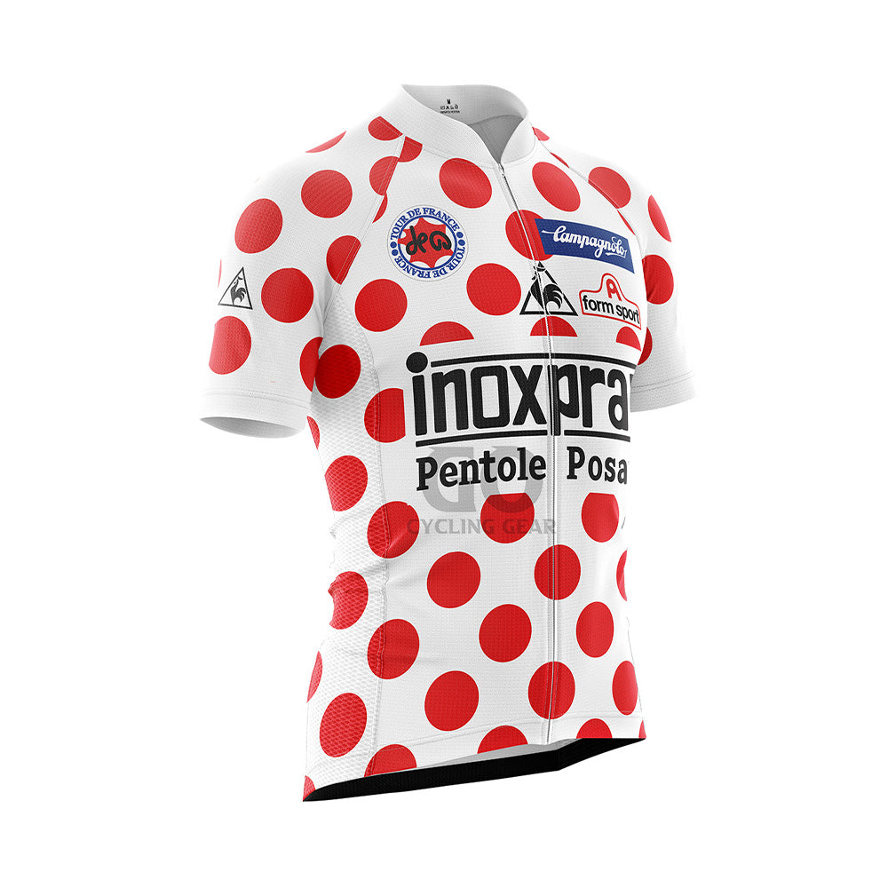 The jersey worn by Giovanni Battaglin in 1979 as the winner of the King of the Mountains classification in the Tour de France is a distinctive symbol of his climbing prowess and determination. The design of the jersey reflects the sponsorship of “Inoxpran pentole posate”, an Italian brand of cutlery, dinnerware, and glassware. The name "Inoxpran" is derived from "inox," meaning stainless steel, emphasizing durability and quality, while "Pentole Posate" translates to "pots, cutlery, and utensils" highlighting the brand’s focus on kitchenware. Battaglin finished sixth in the general classification and won the red dot jersey as a distinction for his resilience and climbing skill during the grueling mountain stages across the Alps and Pyrenees.