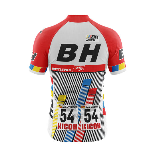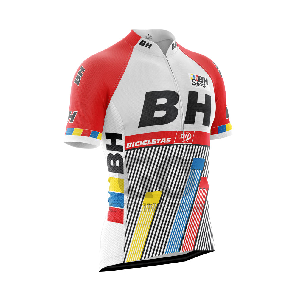 This is the vintage cycling jersey of the former Spanish BH sport team, which was present in the peloton between 1987 and 1989. The team was based in the Basque Country region of Spain and had a strong focus on developing Basque talent in the sport of cycling.